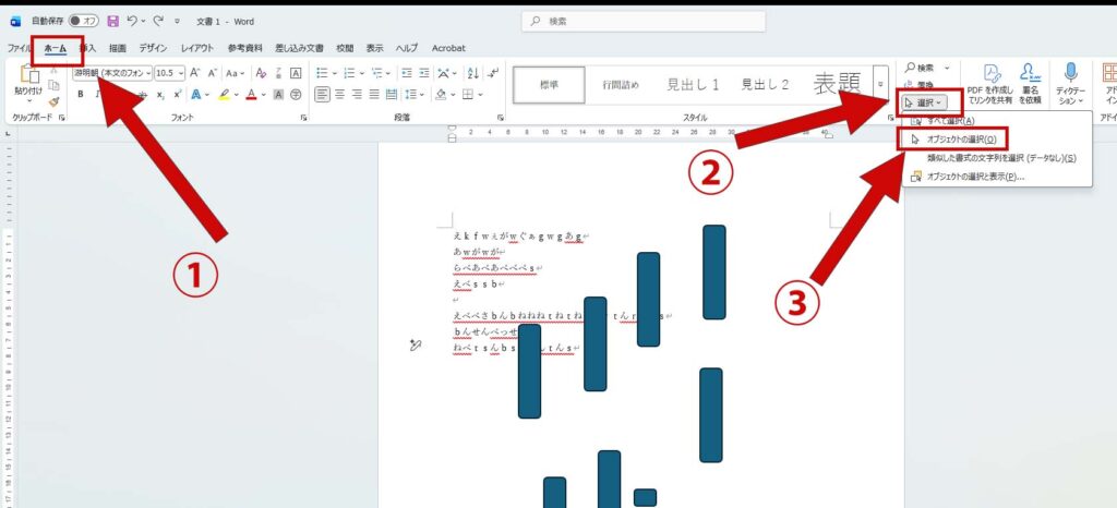 ホームタブ「選択」の中のオブジェクトを選択をクリック