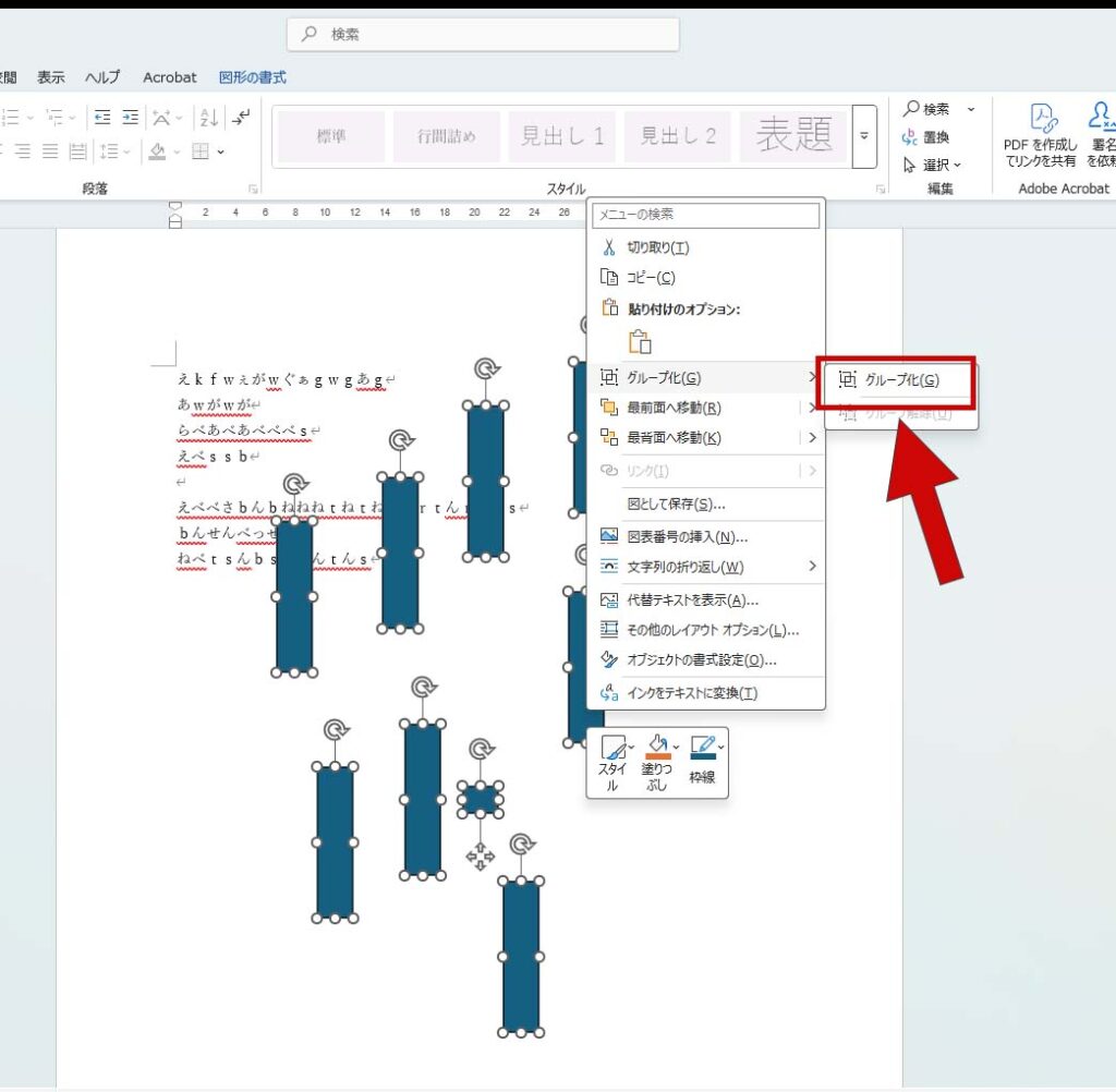 文字情報や画像(図形)などが複合された書式の中で、画像だけを一括で選択しグループ化する方法。